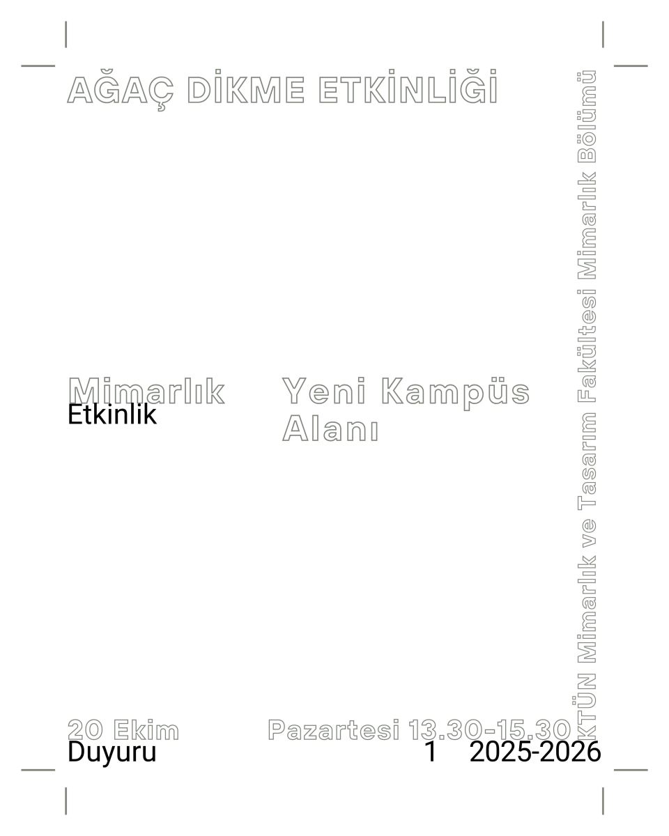 20 Ekim 2025 tarihinde Pazartesi günü 13.30-15.30 saatleri arasında KONAL Yapı İnşaat firmasının katkıları ile Konya Teknik Üniversitesi Ana Yerleşke Alanında Ağaç Dikme Etkinliği yapılacaktır. Ulaşım için 13.15'te Fakülte binası öğrenci girişinde bulunmanız gerekmektedir. Öncelik Mimarlık Bölümü birinci sınıflarımız olmakla birlikte tüm öğrencilerimizin katılımına açıktır ve katılım 100 kişi ile sınırlıdır.