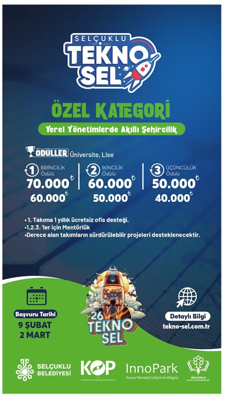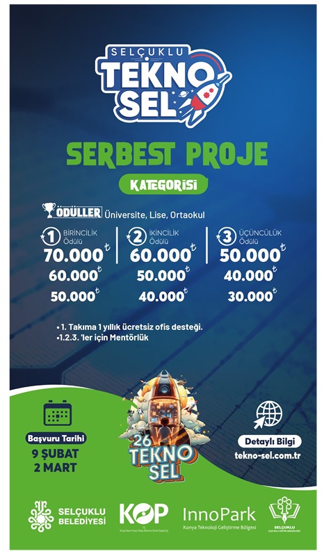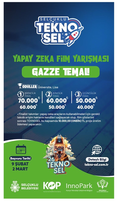 Selçuklu Belediyesi tarafından bu yıl üçüncüsü düzenlenecek olan TEKNOSEL Teknoloji ve Robot Yarışması, Türkiye Yüzyılı vizyonu doğrultusunda Milli Teknoloji Hamlesi'ne katkı sunmayı amaçlayan önemli bir teknoloji organizasyonudur. Yarışma; öğrencilerin teknoloji, yenilikçilik ve üretkenlik alanlarındaki potansiyellerini ortaya koymalarını hedeflemektedir. 15-17 Mayıs 2026 tarihleri arasında Selçuklu Kongre Merkezi'nde gerçekleştirilecek organizasyon kapsamında; Gazze temalı Yapay Zeka Film Yarışması, Yerel Yönetimlerde Akıllı Şehircilik (Özel Kategori) ve Serbest Kategori başlıklarında yarışmalar düzenlenecektir. Ayrıca etkinlik süresince atölyeler ve teknoloji tanıtım stantları da yer alacaktır. Bu kapsamda hazırlanan ve yarışmaya ilişkin detaylı bilgilerin yer aldığı metin ekte gönderilmiştir. Tüm öğrencilerimizin bilgisine.