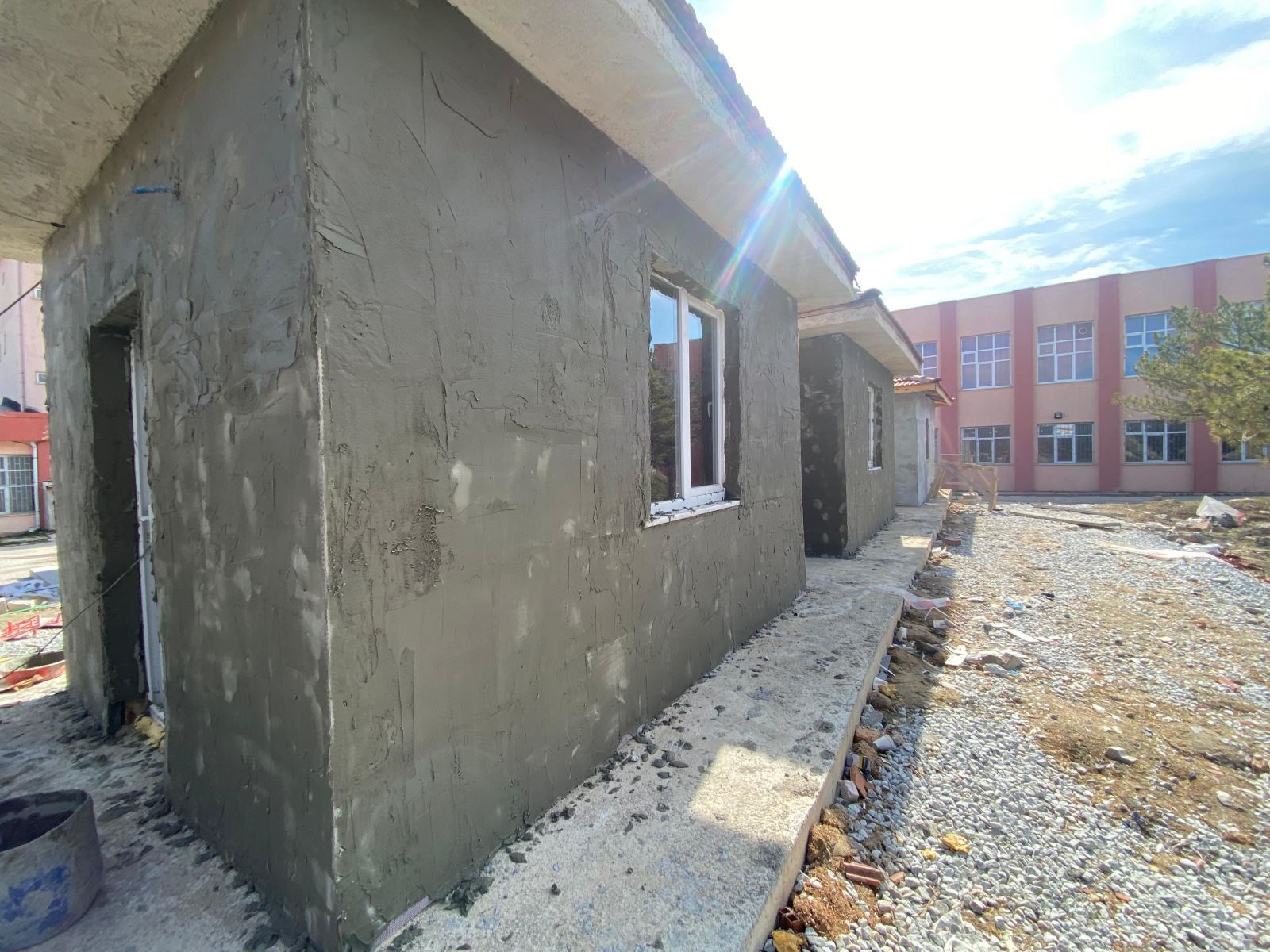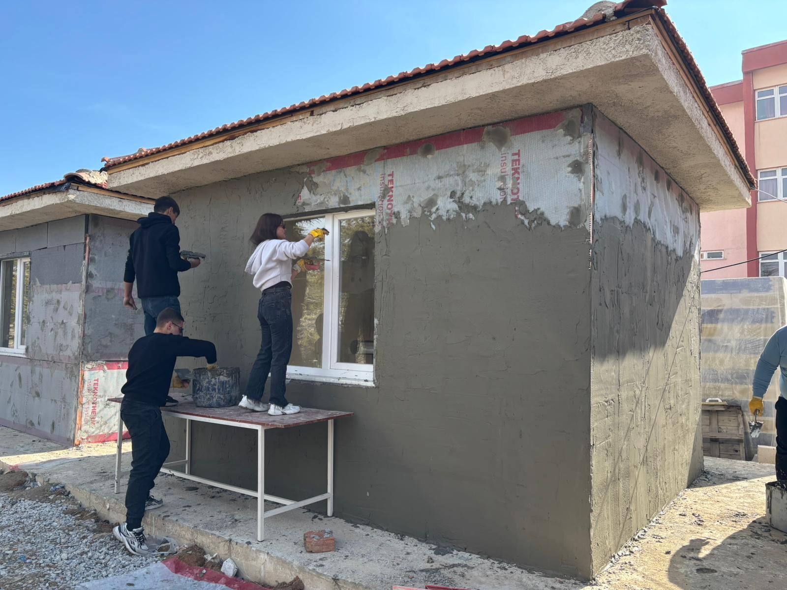 Daha önce EPS levha yapıştırma uygulaması tamamlanan dört binanın tamamında bu kez donatı filesi yerleştirilmesi ve sıva katmanının oluşturulmasına yönelik uygulamalı eğitim verilmiştir. Eğitim kapsamında öğrenciler; sıva harcının teknik şartnamelere uygun kıvamda hazırlanması, yüzeye ilk kat sıvanın uygulanması, alkali dayanımlı cam elyaf donatı filesinin doğru bindirme payları ile yerleştirilmesi ve ikinci kat sıva ile sistemin bütünlüğünün sağlanması aşamalarını sahada birebir gerçekleştirmiştir.