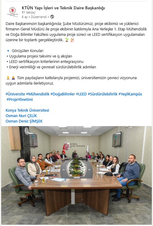 Daire Başkanımızın başkanlığında; Şube Müdürümüz, proje ekibimiz ve yüklenici firmanın Genel Müdürü ile proje ekibinin katılımıyla Ana Yerleşke 1. Etap Mühendislik ve Doğa Bilimler Fakültesi uygulama proje süreci ve LEED sertifikasyon uygulamaları üzerine bir toplantı gerçekleştirdik.