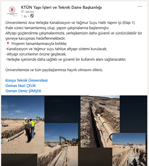 Üniversitemiz Ana Yerleşke Kanalizasyon ve Yağmur Suyu Hattı Yapım İşi (Etap 1) ihale süreci tamamlanmış olup, yapım çalışmalarına başlanmıştır.