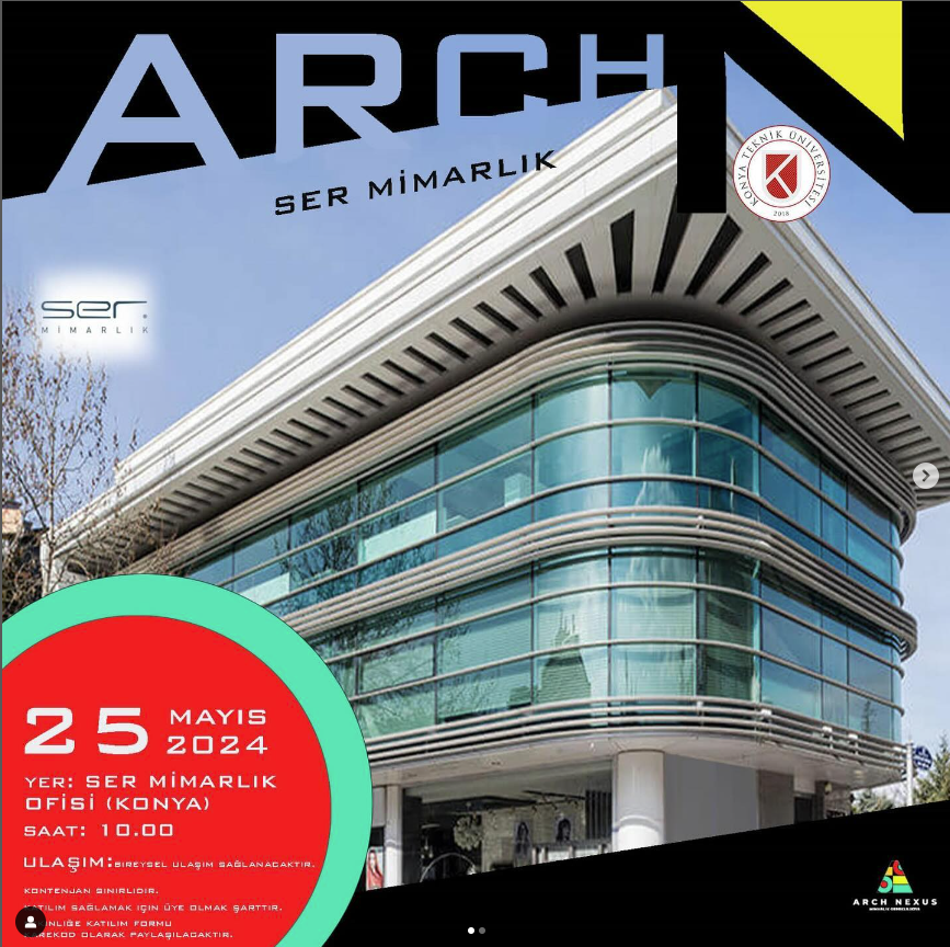 ArcN öğrenci topluluğu tarafından 22 Mayıs 2024 tarihinde saat 10.00'da Ser Mimarlık ofisine, çalışmaları incelemek, Serdar Ekizer ile mimarlık kariyeri ve mimarlık ofisleri hakkında sohbet etmek için gezi düzenlenecektir.