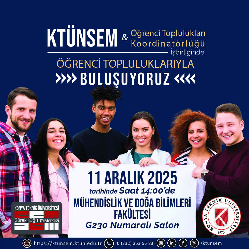 KTÜNSEM ve Öğrenci Toplulukları Koordinatörlüğü İşbirliğiyle 11 Aralık 2025 Tarihinde Saat 14:00 de Mühendislik ve Doğa Bilimleri Fakültesi G230 Numaralı Salonda Öğrenci Topluluklarıyla Buluşuyoruz.