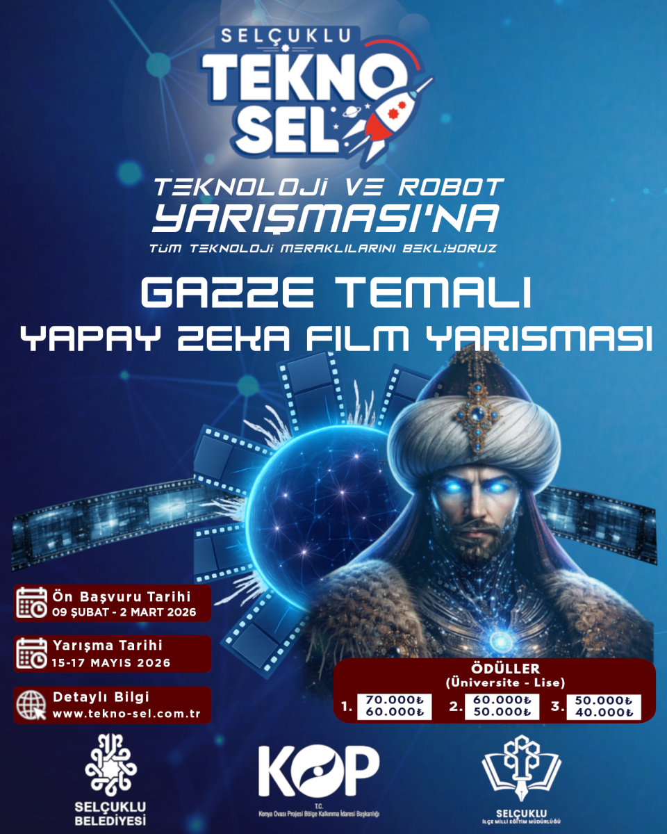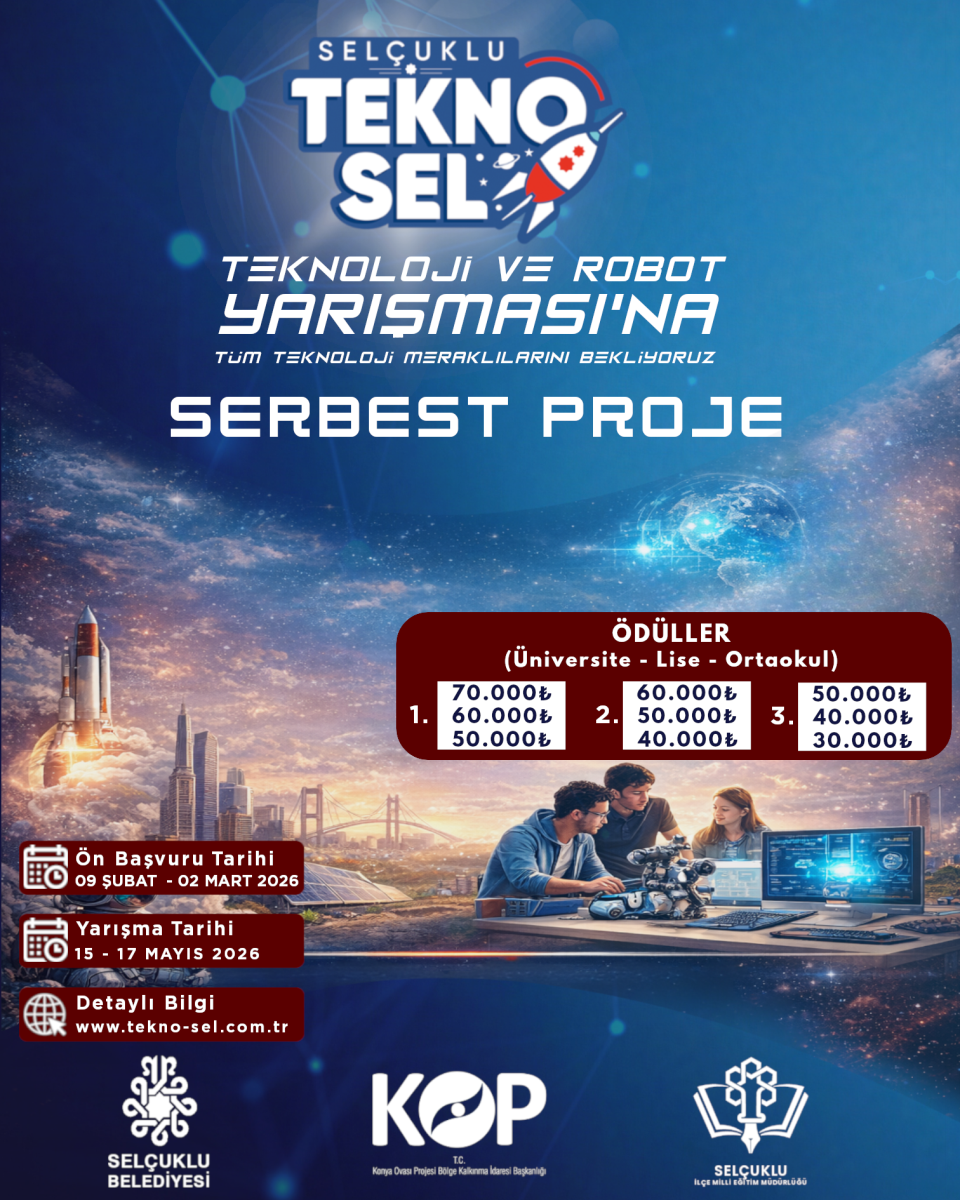 12-17 Mayıs 2026 tarihleri arasında Selçuklu Belediyesi ve Konya Ovası Projesi (KOP) Bölge Kalkınma İdaresi Başkanlığı ortaklığı TEKNOSEL Selçuklu Teknoloji ve Robot Yarışması gerçekleştirilecektir. Detaylı bilgiye aşağıdaki bağlantılardan ulaşılabilmektedir.
