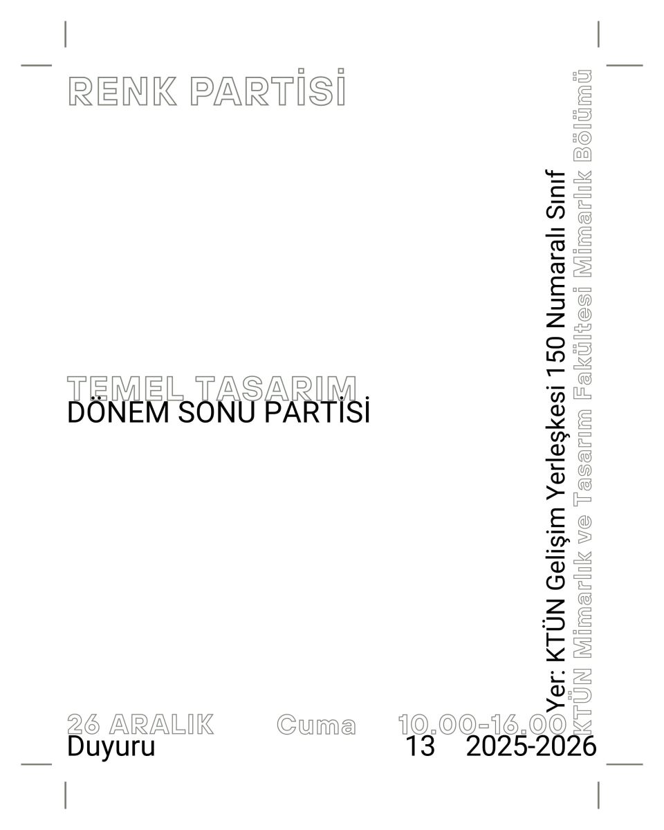 Gelenekselleşen Temel Tasarım Dönem Sonu Renk Partisi bu yıl mavi konseptiyle gerçekleştirildi. Yürütücülüğünü Dr. Öğr. Üyesi H. Elif Uslugil, Dr. Öğr. Üyesi Zeynep Yıldız, Dr. Öğr. Üyesi Elif Merve Erturan, Dr. Mustafa Taşçı, Arş. Gör. H. Ülkü Ünal, Arş. Gör. Ayşegül Berber hocalarımızın üstlendiği etkinlikte, tasarlanan ürünler sergilendi. Aksesuar tasarımları için defile düzenlendi.