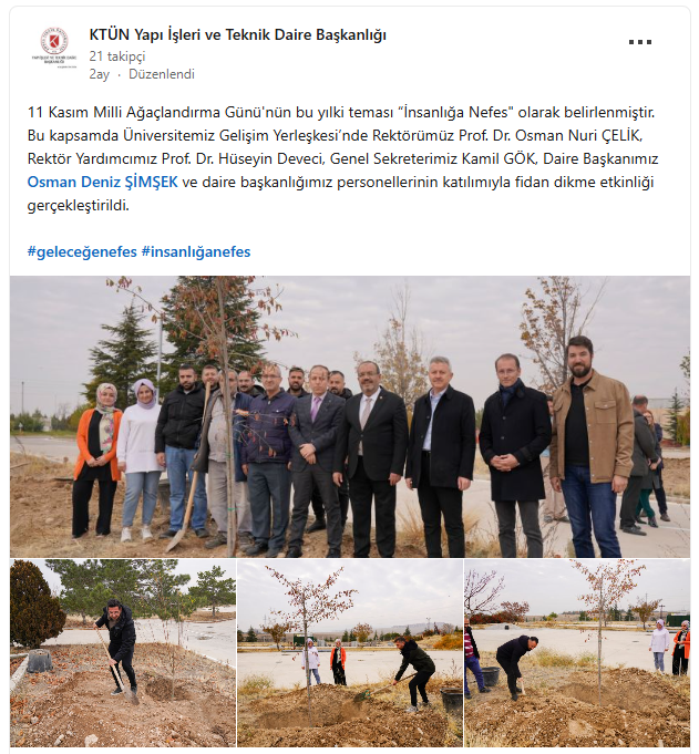 11 Kasım Milli Ağaçlandırma Gününde Rektörümüz Prof. Dr. Osman Nuri ÇELİK, Rektör Yardımcımız Prof. Dr. Hüseyin Deveci, Genel Sekreterimiz Kamil GÖK, Daire Başkanımız Osman Deniz ŞİMŞEK ve daire başkanlığımız personellerinin katılımıyla fidan dikme etkinliği gerçekleştirildi.