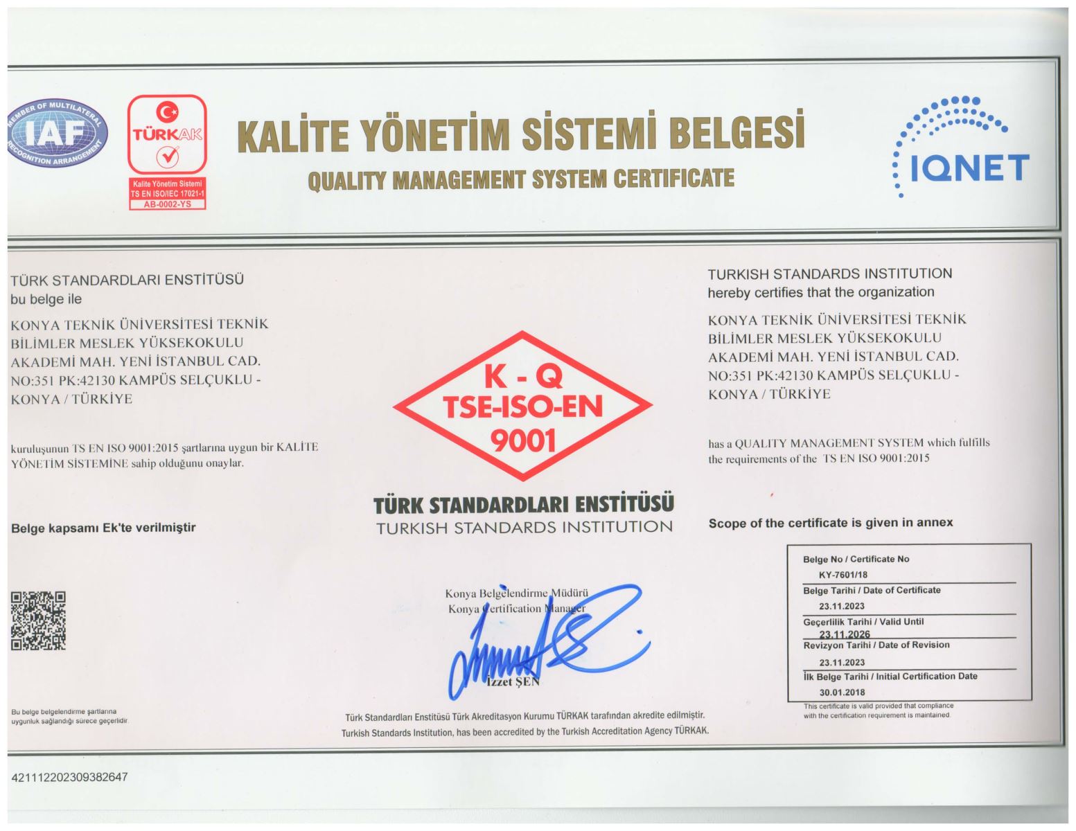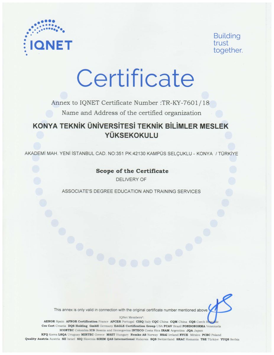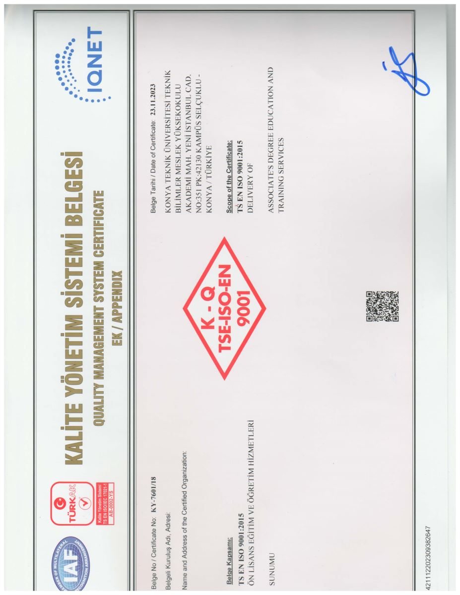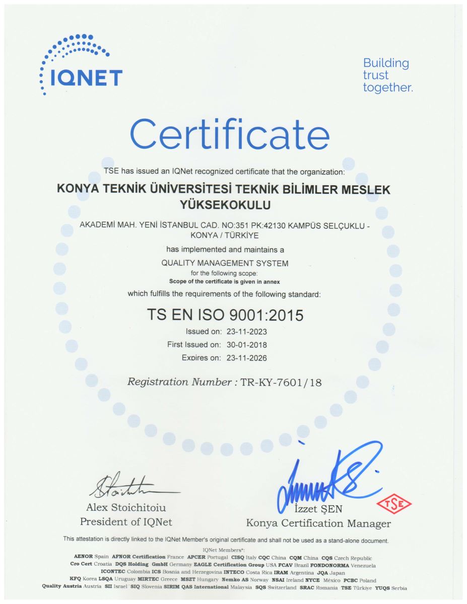 Yüksekokulumuzun 2018 yılında almaya hak kazandığı TS EN ISO 9001:2015 Kalite Yönetim Sistemi Belgesi 3 yıllığına yeniden tescillendi.