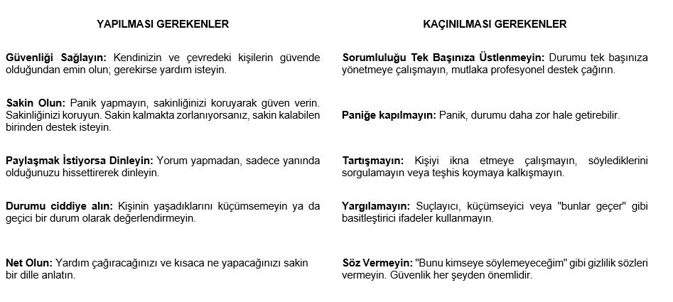 Eğer siz risk altındaysanız, güvenli bir yere geçin ve sizi yalnız bırakmayacak bir arkadaşınıza ya da bir aile üyenize haber verin. Yanınızda birinin bulunması mümkün değilse, derhal destek birimlerine (PDRM, Güvenlik) haber veriniz. İlgili birimler, 112 Acil Sağlık Hizmetleri gelene kadar kişinin yanında kalınmasını sağlar ve gerekli yönlendirme sürecini başlatır.
