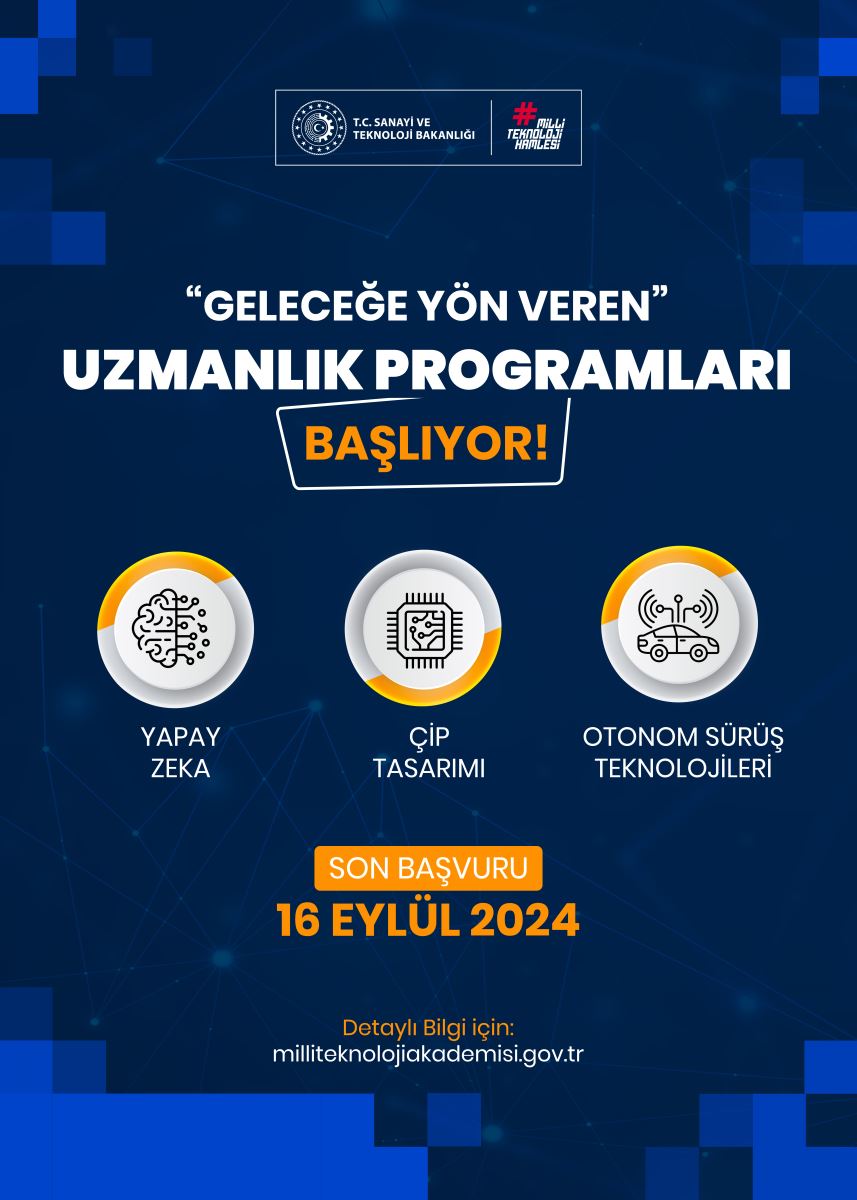 Sanayi ve Teknoloji Bakanlığı tarafından, Ülkemizin Milli Teknoloji Hamlesi çalışmaları doğrultusunda ihtiyaç duyulan nitelikli insan kaynağını yetiştirmek amacıyla Yapay Zeka, Otonom Sürüş Teknolojileri ve Çip Tasarımı alanlarında eğitim programları hayata geçirilmiştir.
