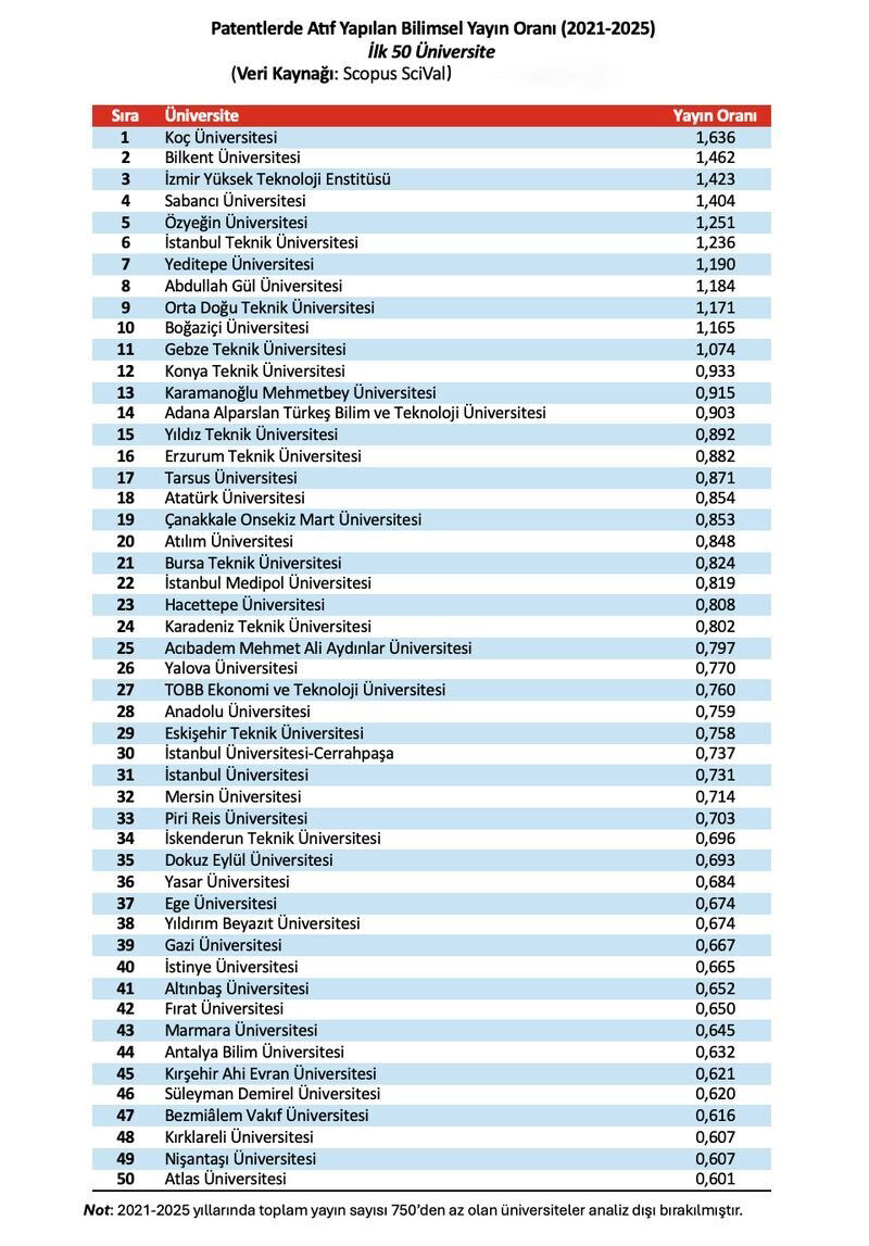 Üniversitemiz, bilimsel üretimin teknoloji ve yeniliğe dönüşümünü ortaya koyan önemli bir göstergede dikkat çekici bir başarı elde etti. Scopus SciVal veri tabanı temel alınarak gerçekleştirilen Patentlerde Atıf Yapılan Bilimsel Yayın Oranı (2021–2025) analizine göre, 0,933’lük oranıyla Türkiye genelinde üst sıralarda yer aldı.